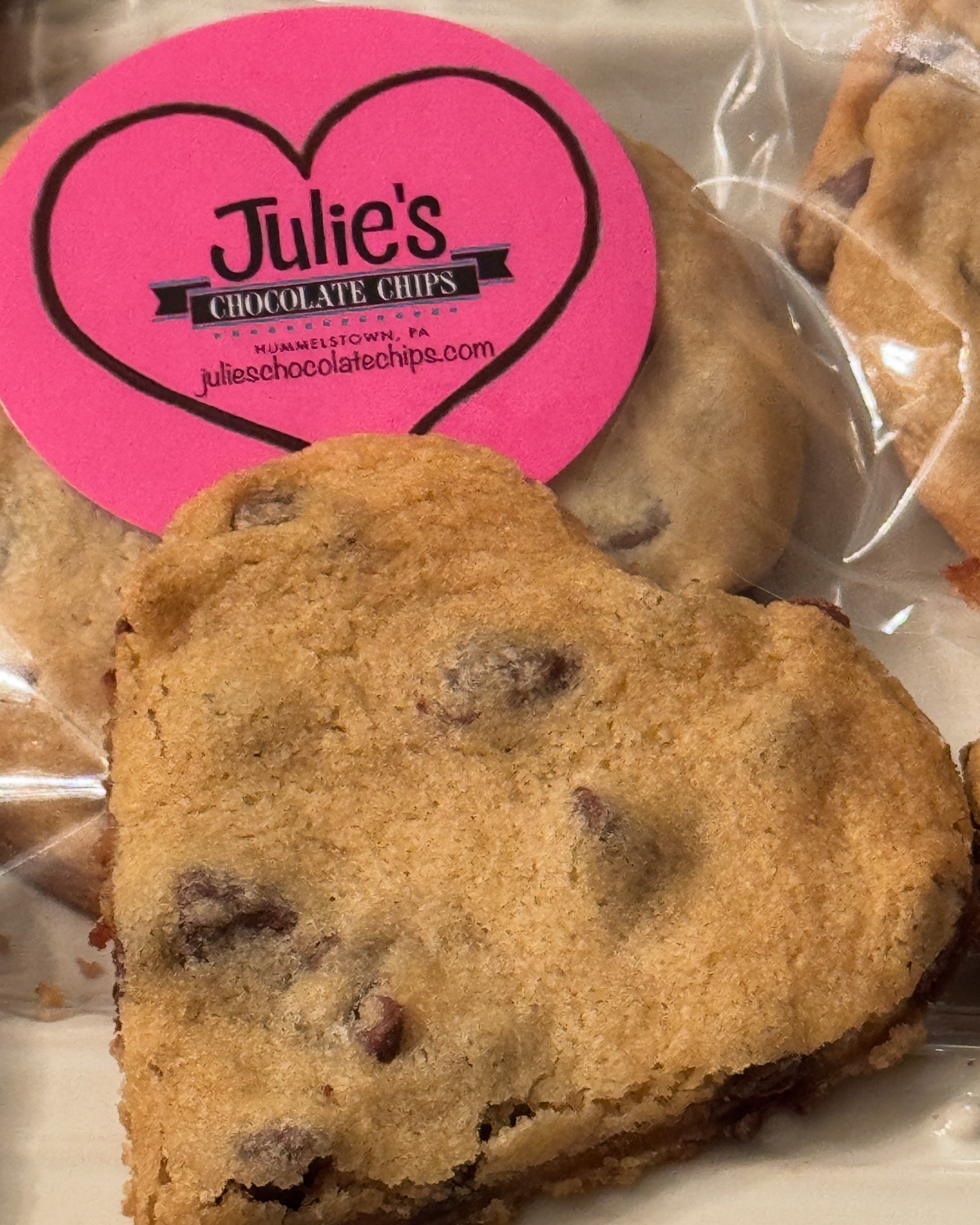 Licensed and inspected by the PA Department of Agriculture, the cookies are scratch-made in Julie's Hummelstown home. Julie and part-time employee, Maggie Kutz, enjoy baking cookies for local delivery, shipping, and hand picked local retailers. Julie and Maggie take custom orders for parties, weddings, corporate client gifts or just to send some "Cookie Love”. Labels for many occasions create a unique experience for every cookie customer. In February, Julie’s Chocolate Chips offers the “heart” shaped cookie for Valentine’s Day.